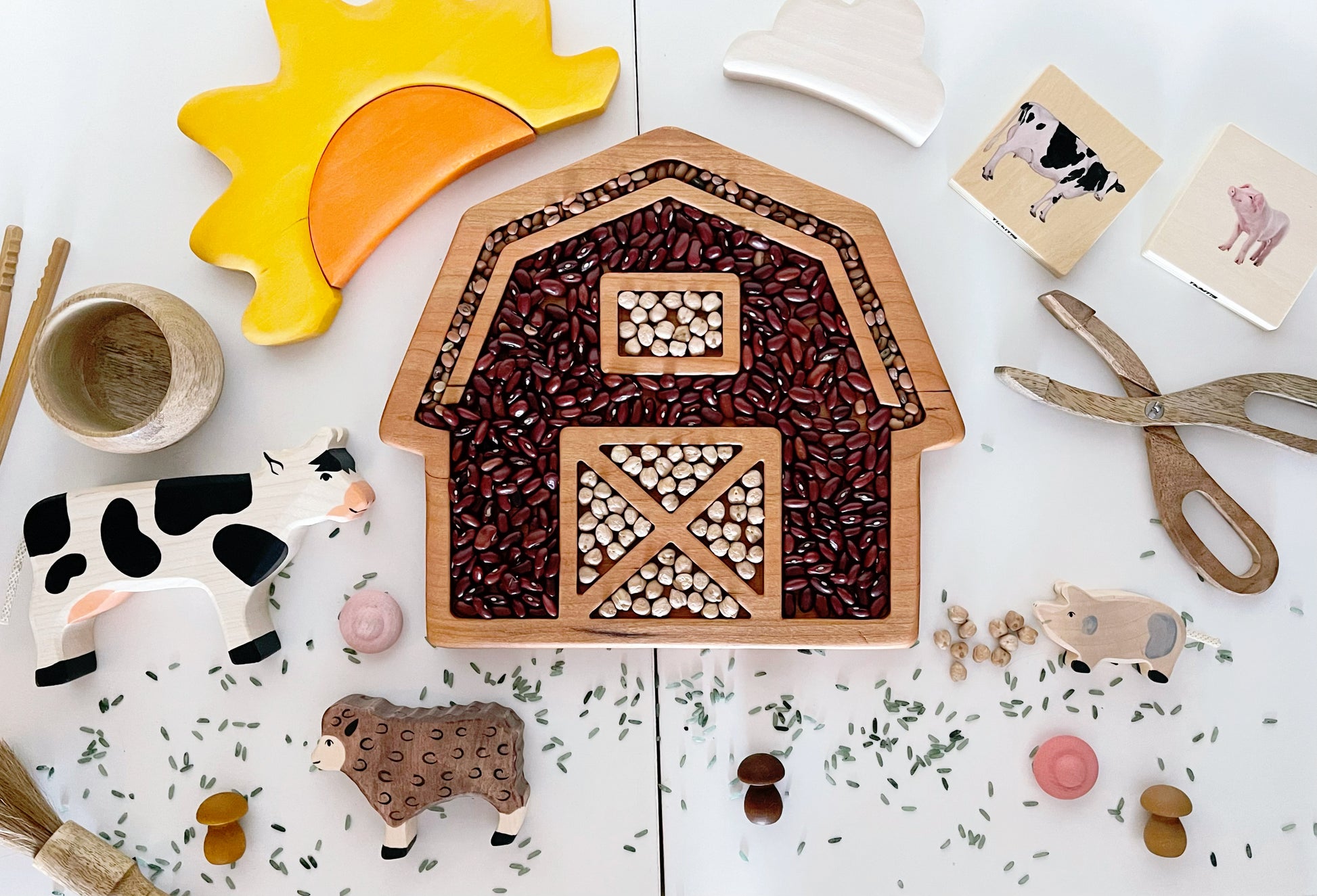 Handcrafted BARN play sorting tinker tray made out of premium cherry wood. Perfect for any farm sensory play