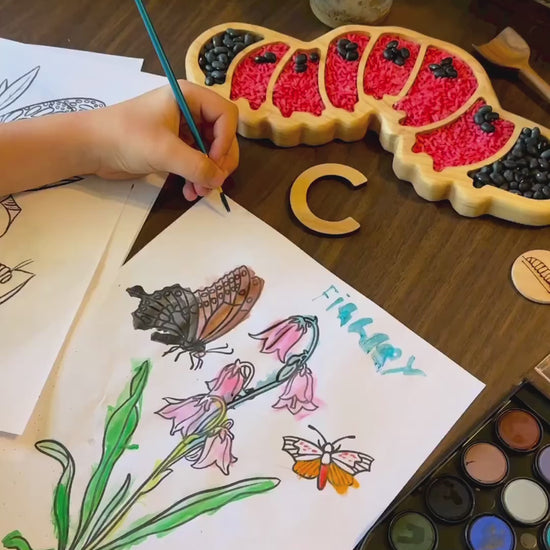 Handcrafted caterpillar play sorting tinker tray made out of premium maple wood. Perfect for any book play, lifecycle, butterfly, or story telling setups. The wood grain and characteristics in the wood differ with each tray, mineral streaks (darker streaks) in the wood may be present in your tray.
