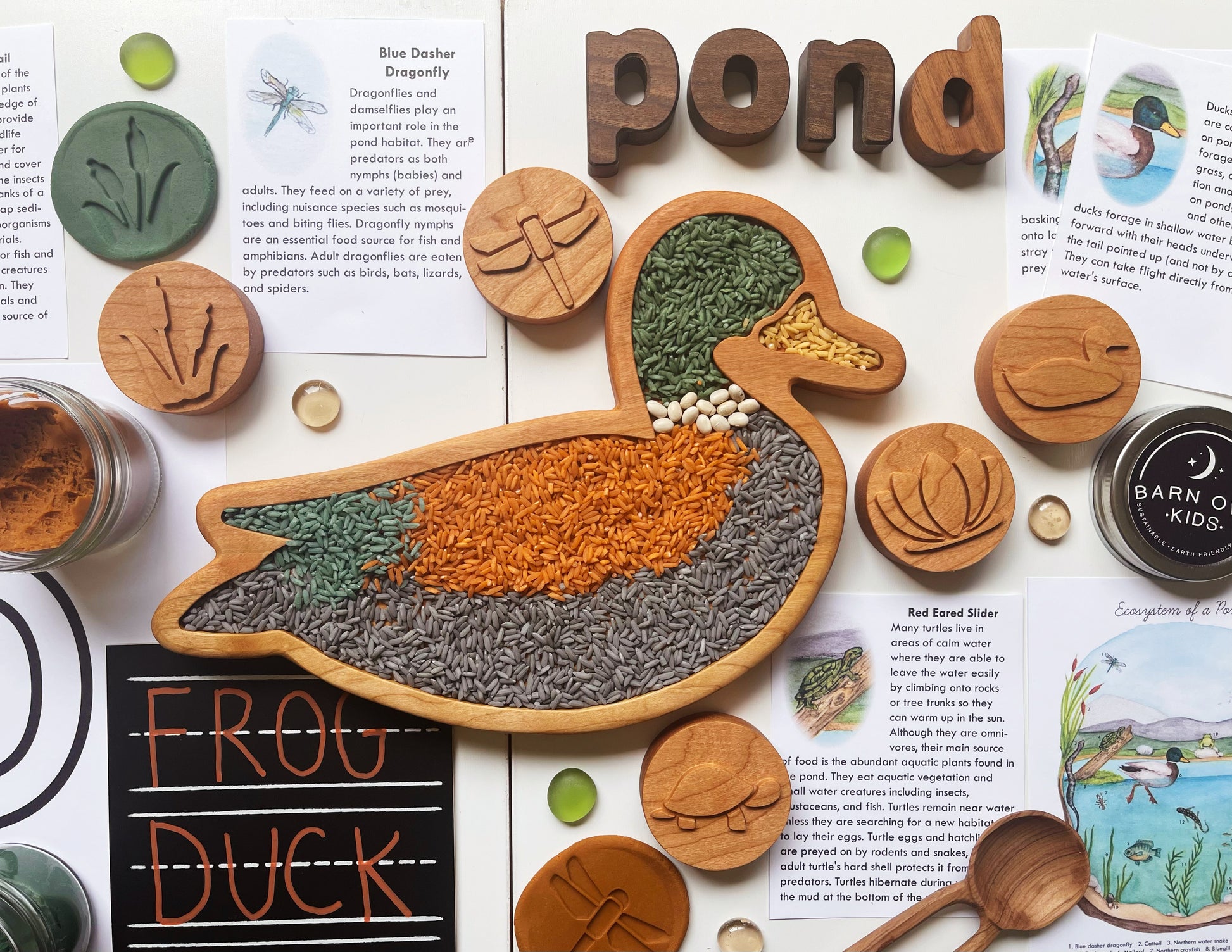Handcrafted duck play sorting tinker tray made out of premium cherry wood. Perfect for any pond, lifecycle, frog & toad, animal, sensory play. The wood grain and characteristics in the wood differ with each tray, mineral streaks (darker streaks) in the wood may be present in your tray.