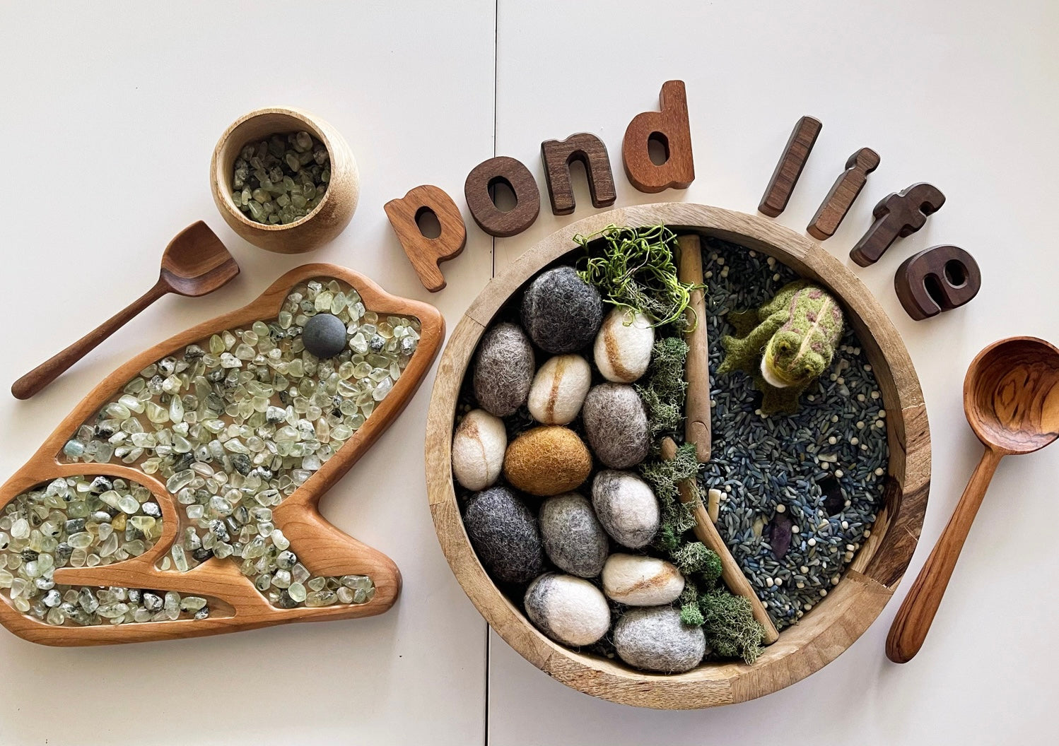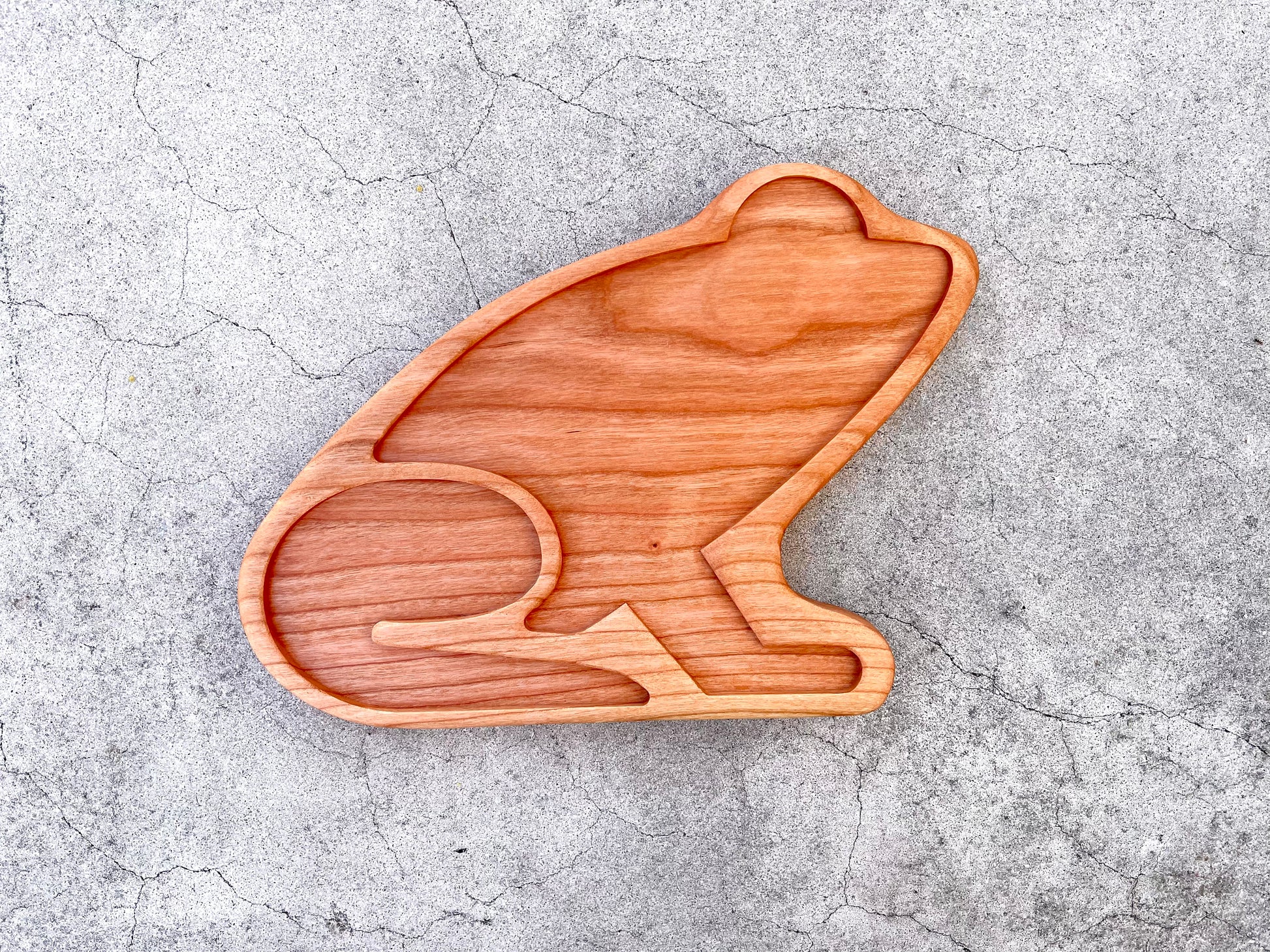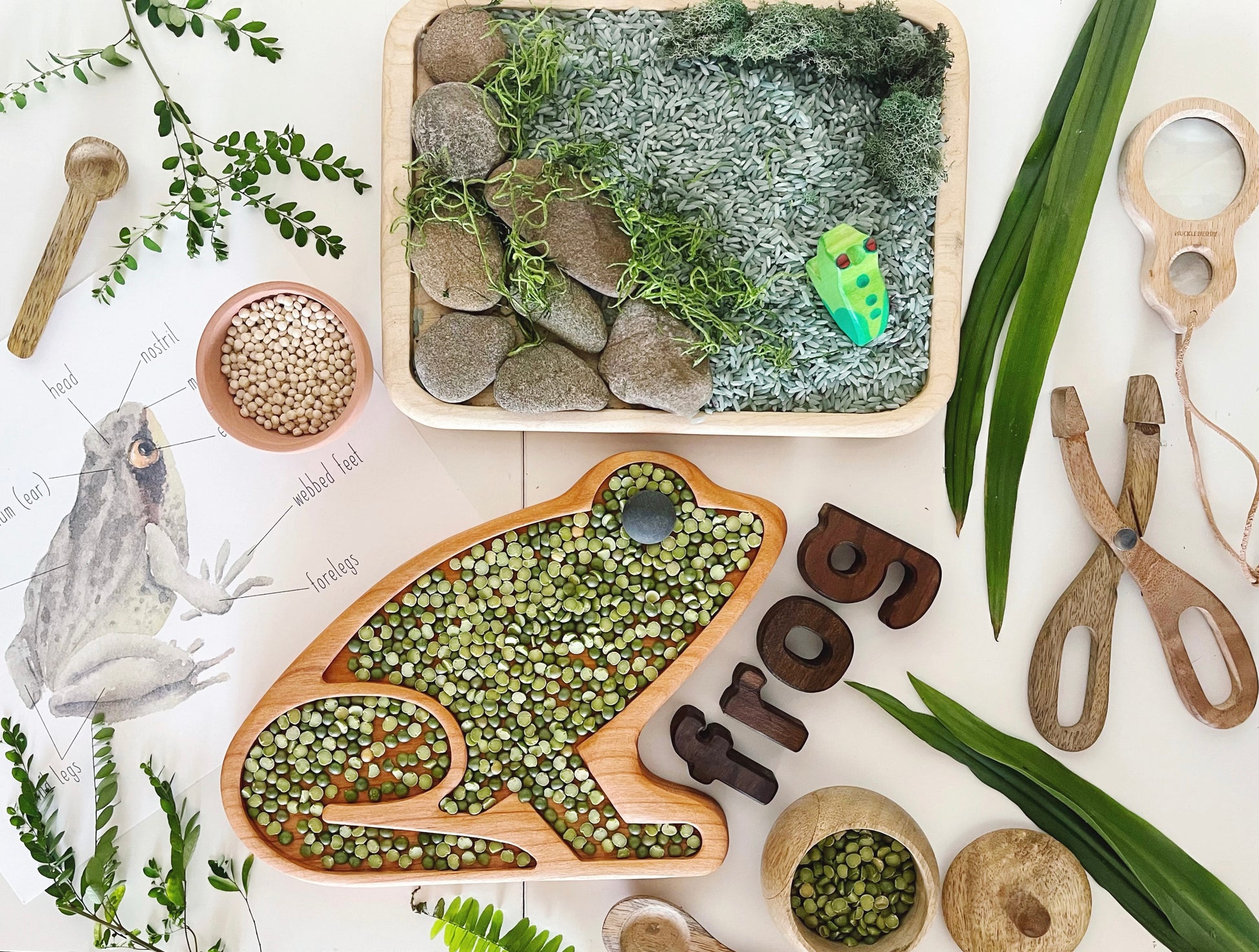 Handcrafted Frog play sorting tinker tray made out of premium cherry wood. Perfect for any pond, lifecycle, frog & toad, animal, sensory play. The wood grain and characteristics in the wood differ with each tray, mineral streaks (darker streaks) in the wood may be present in your tray.