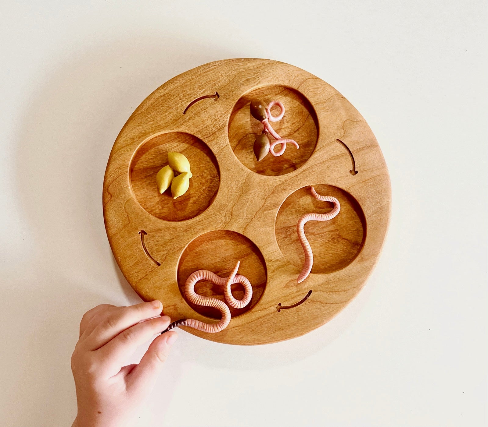 LIFE CYCLE tray made out of premium cherry wood and polished with organic bees wax and mineral oil. Beautiful educational addition to any school classroom to give children visual information about the lifecycle, and how it works. The wood grain and characteristics in the wood differ with each tray, mineral streaks (darker streaks) in the wood may be present in your tray.