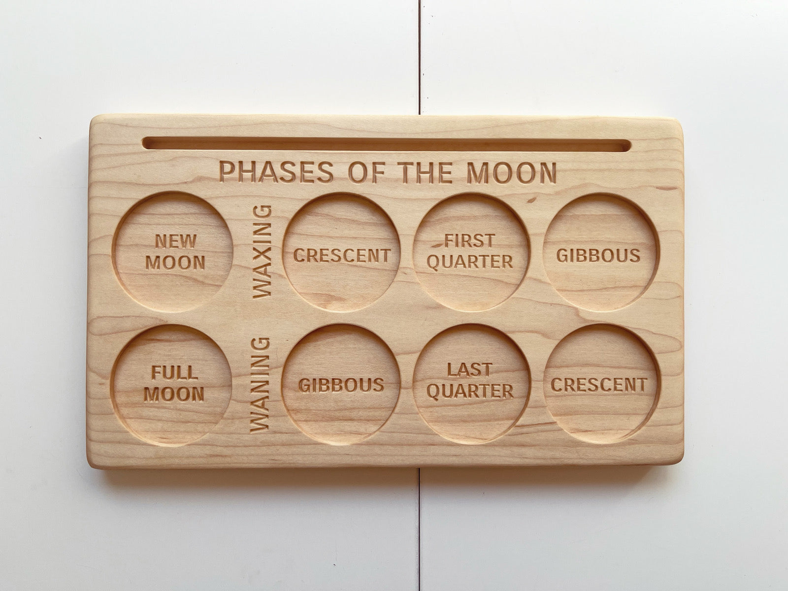 The set includes 8 walnut wood moon phase stamps, and one maple wood moon phase puzzle sensory board